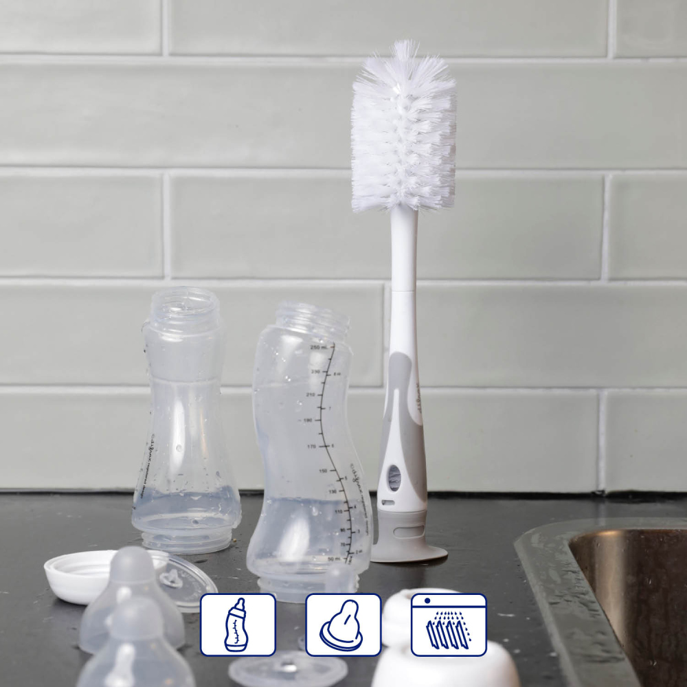 Maak de babyfles altijd eerst goed schoon met een flessenborstel voordat je de fles steriliseert. Zo blijven er geen melk- en flesvoedingresten achter, die schadelijk kunnen zijn voor de gezondheid van je baby. Reinig de flessenborstel onder de hete kraan of in de vaatwasser.